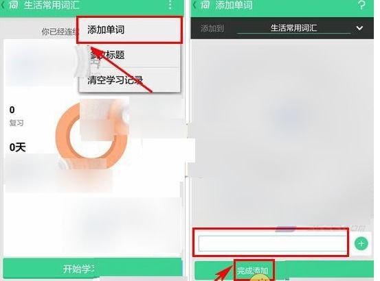 2、点击【添加单词】,然后点击下方方编辑框输入单词,最后点击【完成添加】即可。(如下图)