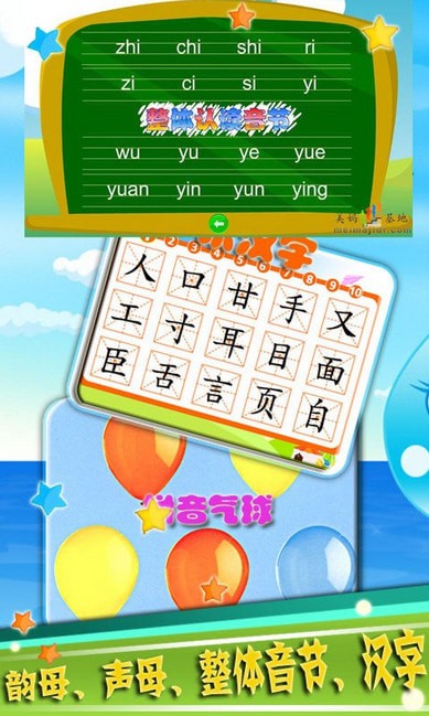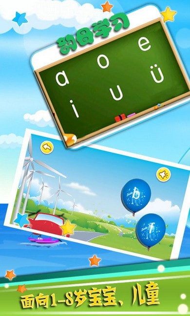 2、本软件包含所有的学前汉语拼音学习和益智游戏,适用于学前幼儿园和一年级,二年级小学的小朋友学习。