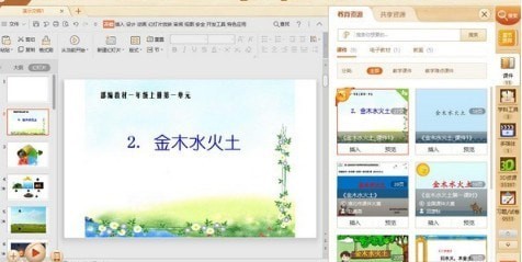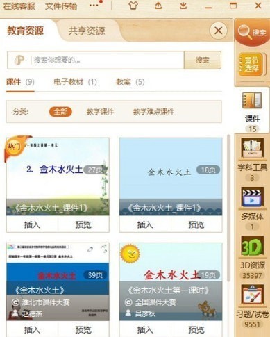 3、软件右侧栏会给出现成的教学资源,直接导入使用,比如说课件,教案和电子教材。