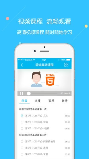 在线录播:章节学习、笔记回看、课程收藏、评论打分、进度跟踪等。