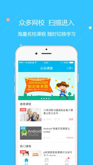 云朵课堂,教育机构一站式服务云平台,教育行业专业SAAS服务提供商,云朵课堂提供一个低成本做在线教育的一站式解决方案,包含课程点播、教学管理功能,可快速搭建属于自己的网络教育系统,并迅速开展网络教学,扫描网校二维码进入网校,海量课程,高清视频课程,流畅观看,随时随地学习,真人直播教学、在线互动、万人同时在线、便捷的个人中心,有效学习。