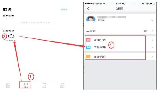1、点击app底部的“服务”按钮,进入“移动迎新”,可以看到新闻公告、信息采集、结伴同行相关功能。