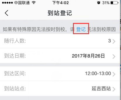 3、到站登记,需填写随行人数、到达日期、到达区间、到站站点信息,如果开学期间无法到校,请点击“登记”选择无法到校原因及情况说明。