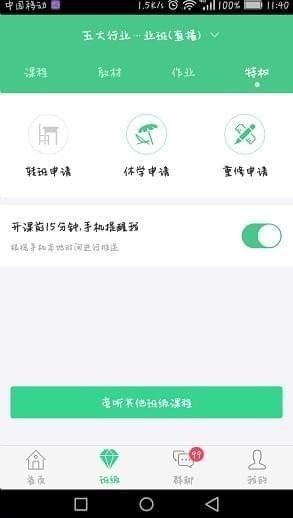 4:点击“我的班级”可以查看到当前的课程、教材、作业、特权等操作功能,课程可以下载。