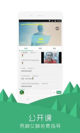 2:进入首页,可以查看到相关公开课,题库、视频、报班、答疑、我的班级等功能。(新增群聊功能)