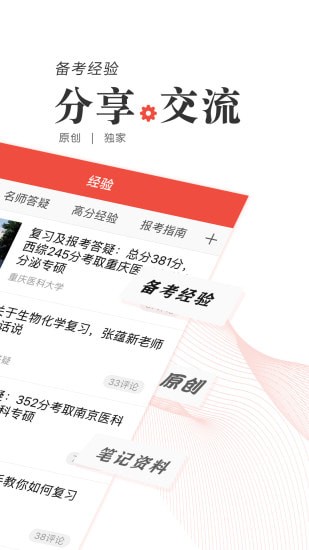 真题题库随时刷、强大名师课程即时看、更有高分经验作者随你聊,真题+视频+经验+互动+答疑五位一体,为考研医学生提供全程、全方面的考研指导。