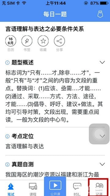 点开左下角“笔试”,看到有今天的题型概述,真题自测和解析