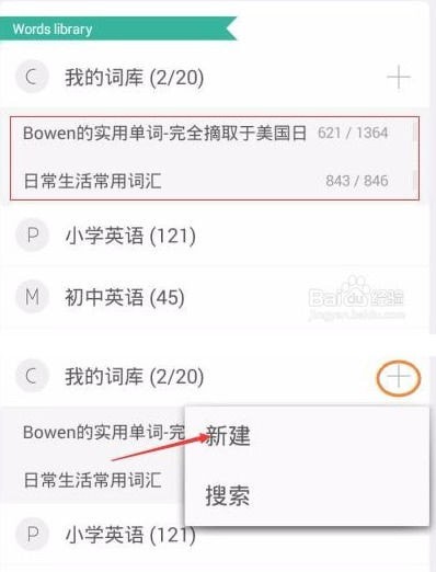 2.进入软件,点击底部第二个“选词”——我的词库,点击“我的词库”,看到展开列表中已有的词库。点击“+”——新建