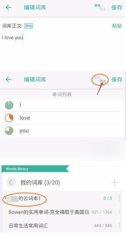 4.例如,输入“i love you”,点击“预览”,可以看到提取单词的列表,点击“保存”,即可看到创建的词库已加入“我的词库”