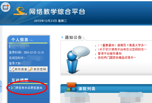 成功登陆后,会有各种课程列表和一些课程学习任务通知,根据个人需要来查看通知。
