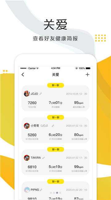 亲友间也可通过“关爱”功能查看亲友的健康情况并进⾏沟通交流,