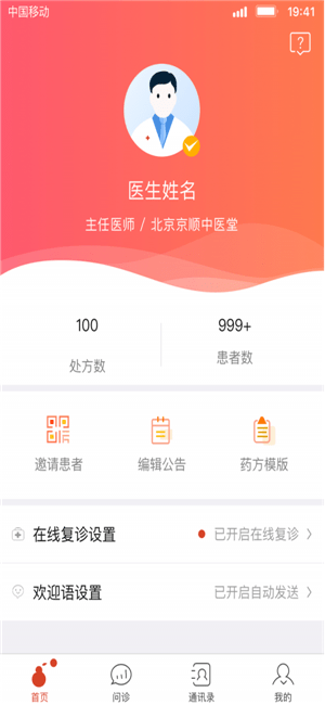患者通过微信公众号提交初诊病历、主诉、问诊单、舌面照后,医生可以在此应用随时查看患者电子病历,与患者沟通,线上复诊,辩证开方。