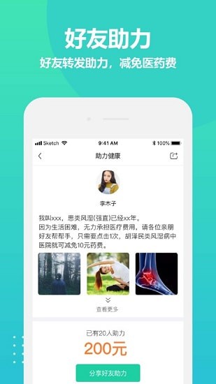 还可以分享治疗经验与同城病友一起互助康复,可以发起助力展示个人病患治疗情况,赢得互助机会,可以分享邀请病友开启健康创富新人生。