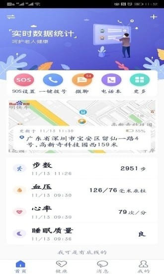 2、健康关爱:关爱老人、随时查看计步、心率、血压等健康数据报表