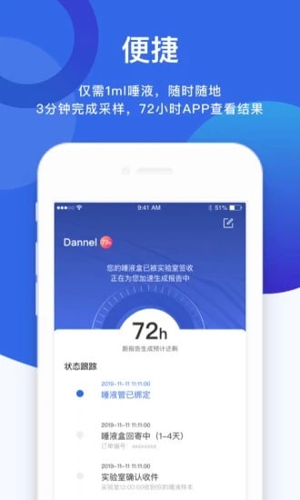 3.用户自行采集检测样品(唾液、毛发等)或到检测中心采集样品(血液等)后,通过基因宝app及时了解检测过程和状态;