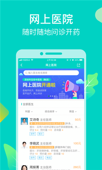 在线挂号:作为全国多个重点省市的预约挂号统一平台,覆盖深圳儿童医院、香港大学深圳医院、南山人民医院、广东省中医院、北京大学深圳医院等数千家三甲医院,可预约号源超过200万;