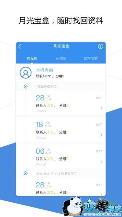 随时找回:随时可在月光宝盒中,通过回收站或时光机找回找回误删的联系人