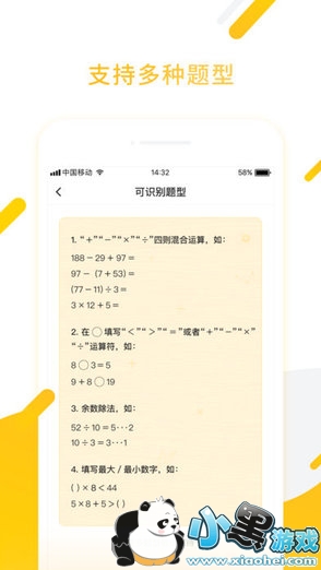 2. 多种题型,准确批改:支持口算题、竖式计算、单位换算、选择题、判断题、应用题、填空题等题型的检查,准确率高达99%以上;