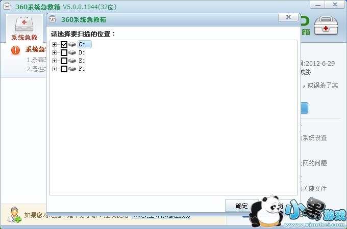 第四步:点击“确定”之后,360系统急救箱开始进行对您选择的扫描位置进行扫描。
