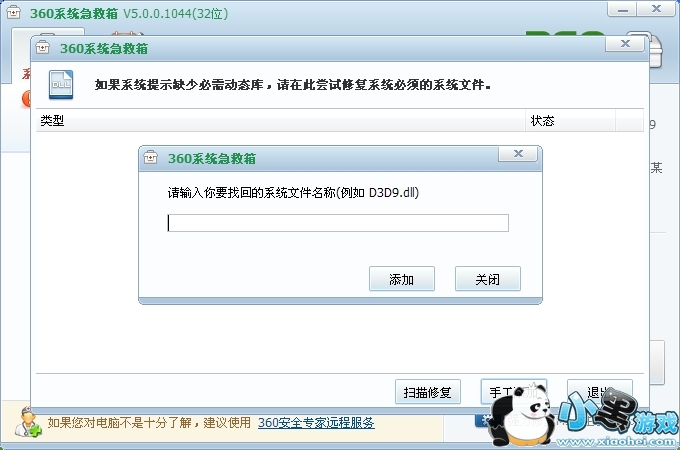 (注:如果扫描修复还是无法解决问题,请使用“手工添加功能”进行手动添加缺失的系统文件。)