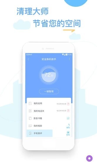 【一键换机】一键轻松换,支持通讯录、软件、短信、文件、通话记录、书签、图片、音乐、视频、日程等多种数据传输。