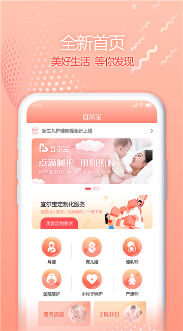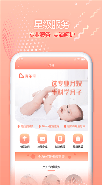 宜尔宝是一款提供母婴护理服务的软件,这里的服务多,包含了额月嫂、育儿嫂、催乳师、医院陪护、小月子照护和产康师六大服务,致力于给用户提供最全面的照料,体验最专业的服务,用户线上就能马上预约服务人员,选择服务类型,每一个阿姨都有专属资料,擅长领域、经验、服务星级等信息,便于用户对比和选择服务人员;这里的服务人全部都持证上岗,拥有专业的技能和诚信保障,用户们在线就能寻找到专业的母婴服务,轻松享受星级服务,覆盖了国内外城市,随时都能预约服务。