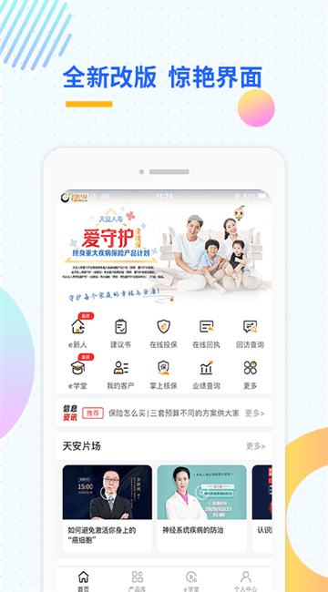 天安e点通安卓版是一款效率办公软件,天安e点通app是个面向于保险从业人员打造的实用软件。在天安e点通app你可在线管理团队成员,在线快捷报价等。天安e点通安卓版是天安人寿面向服务人员研发的,为客户提供保单电子体检,实现客户保险数字化,智能化,科学计算客户的保障需求及缺口,并进行智能推介和线上投保的一站式服务项目,致力于为客户创造价值,实现真正的“按需推介”的保险销售。未来将客户管理、清单管理、活动量管理,以及报表体系、客户服务、线上培训等功能集成为一体,全力打造天安人寿保险服务平台。天安e点通app是天安人寿专门面向服务人员所开发的一个办公软件,它为客户提供了保单电子体检,更好的实现了数字化服务模式,可以采用大数据科学化的分析相关数据信息,然后为你提供智能化投保服务,真正的实现了按需推荐的保险销售服务,在此软件中还拥有着保险商城、佣金查询、团队架构、续收管理等等功能板块,能够更加高效的提高人员的办公效率,更好的促进行业的快速发展,同时在这里你还可以通过大量的精品课程进行学习,感兴趣的话就赶快来下载天安e点通app进行安装使用吧。