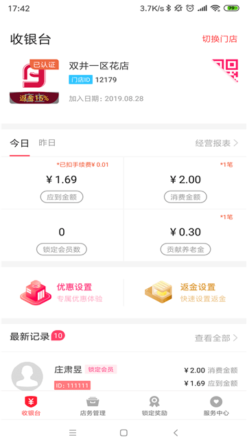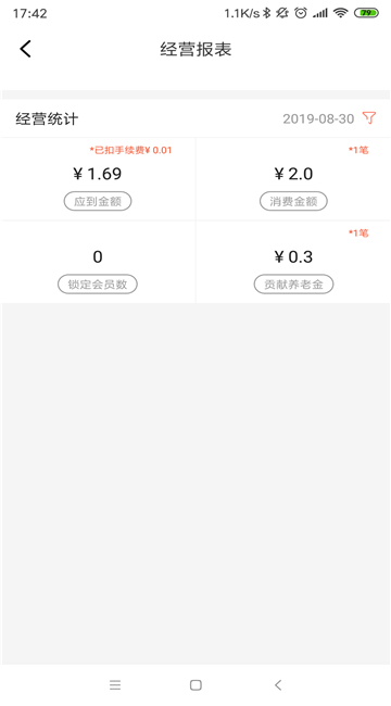 查看经营报表,店主可以清楚的知道应到金额、消费金额和锁定会员数与贡献养老金的数目;