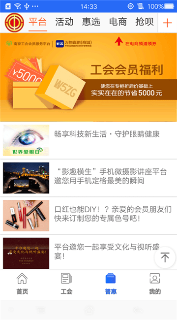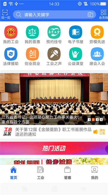普惠服务:以工会会员为中心,通过平台为会员提供了众多的特惠服务,比如:电子书屋、免费讲座等。