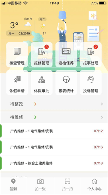 3.主界面包括核查管理、报修管理、巡检保养、报事处理、休假申请、休假审批、报表统计等选项,可查看待整改、待维修以及相关时间等信息,
