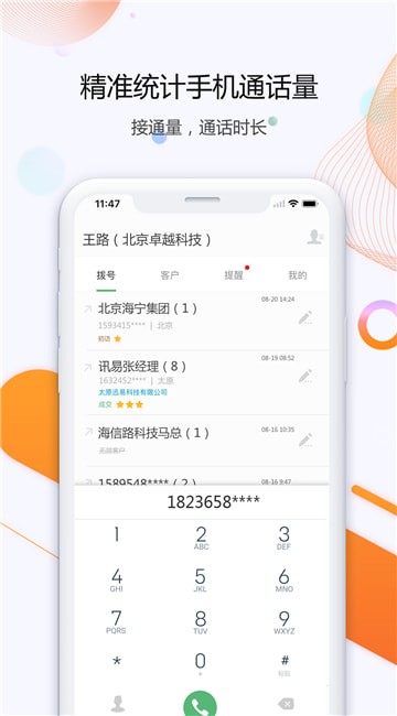 小话统app是一款非常实用的拨号统计工具,用户通过这款app就能轻松统计销售部门的所有电话量、通话时长、接听量等数据信息,能够让用户更好的计算销售部门通话数据,达到激励销售部门人员的工作积极性,大大提供公司的发展和效益,让您更好的与客户管理彼此关系;小话统安卓版还能直接连接公司的数据库,会自动为你生成客户的资料,实现对客户进行精准分级,实时跟踪、记录乐乎的日常通话情况,让你与客户保持更友好的通话关系,有效提高公司的服务质量,为客户提供更好的服务;有需要的用户可以来下载体验。