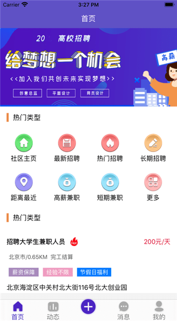 清风兼职一款专业的找工作找兼职的软件。提供最全的兼职类型,最新招聘,热门招聘,长期兼职,距离最近,高薪兼职,短期兼职等多种兼职种类,最大限度的满足用户对兼职的需求。有趣又专业的社区动态,与他人分享交流,有助于自己的成长。找兼职,找工作,就来清风兼职。
