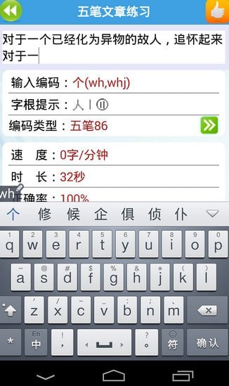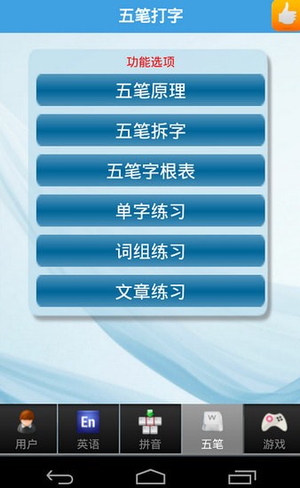 3、五笔练习:可以循序渐进的学习练习五笔字型的输入,用户通过五笔练习,可以较好的学习和掌握五笔输入法,同时也能大大提高五笔的输入速度。疯狂打字通手机版简介