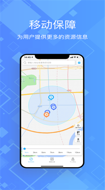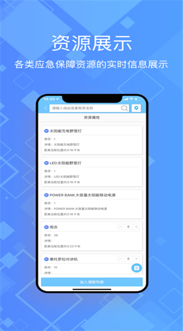 3、圈内资源:依据用户实时位置调整查看周边物资距离,快速获取周边所有的应急资源。