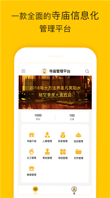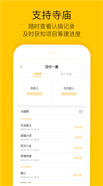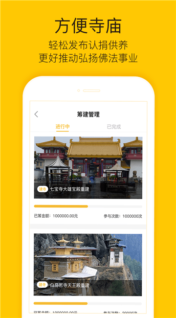 筹建管理:让寺庙获取善信的认捐供养。稳定、透明、便捷的善款统计,方便寺庙和信众即时获知筹建进度。