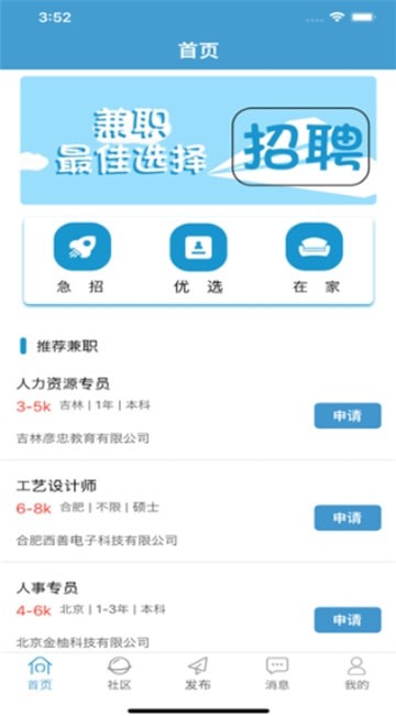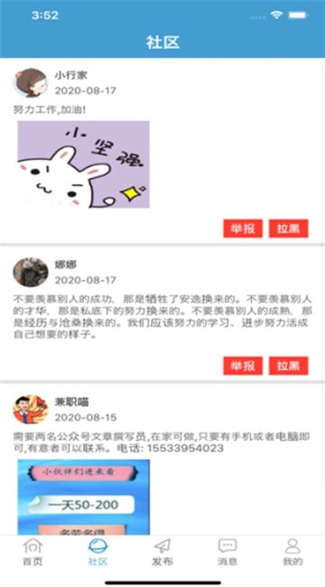 佳轩兼职-认真选择的兼职是一个关于兼职的APP,用户登录后可以在首页模块里申请某条兼职,在社区模块里可以进行举报和拉黑的操作,消息模块中可以查看消息。快来加入我们吧。