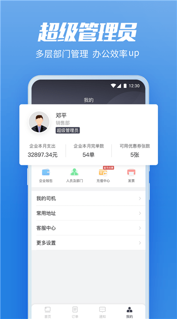 货拉拉企业版配置员工用车权限,预存车费管控用车规范,管理后台查看员工历史用车记录,统一开票;