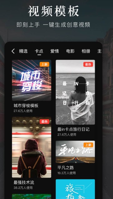 -模板包括电影大片、音乐相册、时下热门、节日主题等