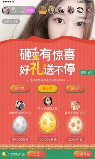 互动交友的同时,动动你灵巧的小手玩一玩砸蛋游戏,人品瞬间爆发,砸中大礼相赠主播,更加赢得美人青睐。