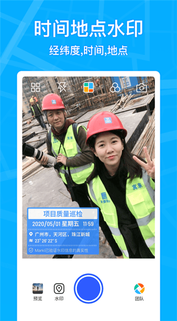 马克水印相机可自定义水印相机的时间和位置,可用于记录照片,打孔卡,值班检查等。内置时间和位置水印,天气水印,经纬度水印,电子时钟水印,工程水印,值班水印,保安巡逻水印特征: