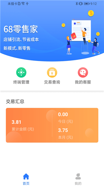 68零售家安卓版是一款供广大商户使用的手机移动端办公软件,平台具有提供收银设备终端绑定、收款记录查询、结算进度查询等多种功能,帮助商家收银更加安全和便捷,提高商家办公效率。