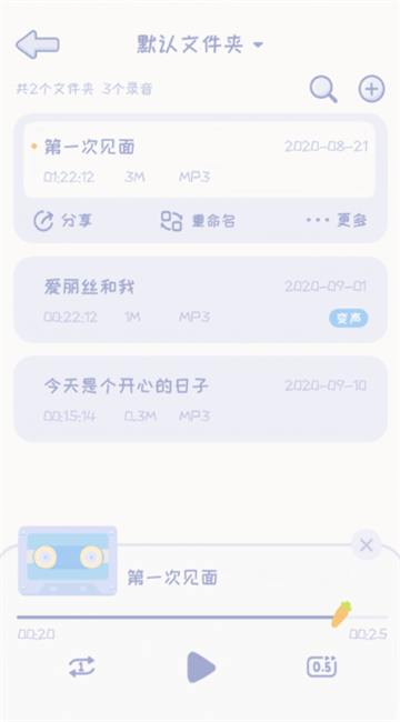 3.录音后还能立即共享。并且还有着一系列功能,如播放、储存和录制。页面简约功能好用。