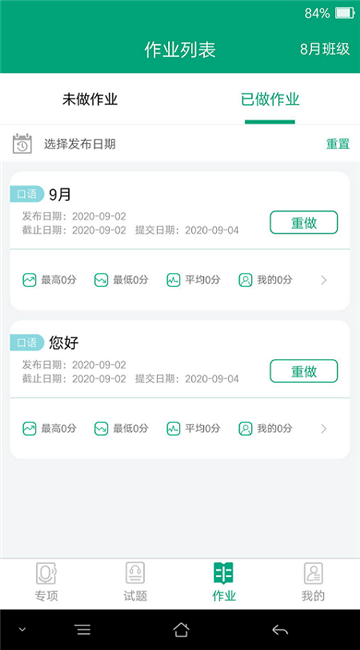 (3)在线作业即时互动:点击“作业”,在线接收老师布置的作业,支持智能化提交学生作业的录音和成绩,便于学生高效完成作业,同时帮助老师针对性讲评。