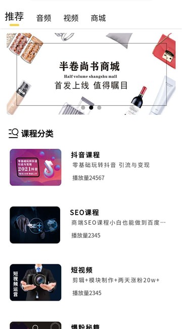 半卷尚书是一款手机在线学习培训教育软件,在这里为用户提供大量抖音、SEO、短视频、涨粉秘籍等培训课程,用户可以根据自己的需求在线进行课程选择,在这里让你足不出户就能了解各行各业,快来单机8下载使用吧!