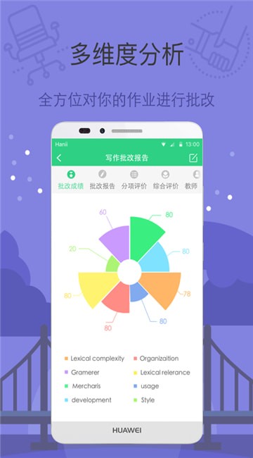 根据不同考试的评分标准,有针对性的生成多个维度的批改分析报告,老师可以实时介入学生的英语练习,加入更多的反馈信息和批改建议。