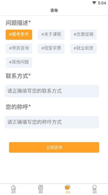 3、在咨询页面,即可选择描述问题、填写联系方式以及称唿即可提交