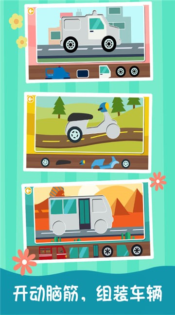 这里设计了多种的游戏场景,孩子可以在各个场景中了解各种汽车的用途;