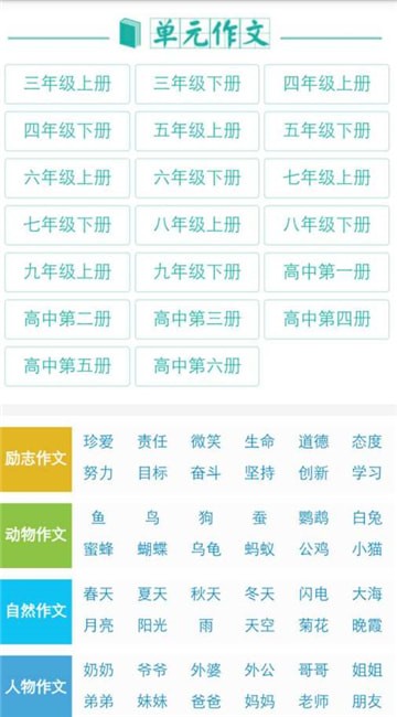 语文同步作文大全免费版,涵盖了小学、初中、高中各年级作文,囊括了单元、考试、话题、字数、英文以及分类等类型作文,还提供了基础知识、作文技法、作文素材,是各位学生学习写作的好帮手。