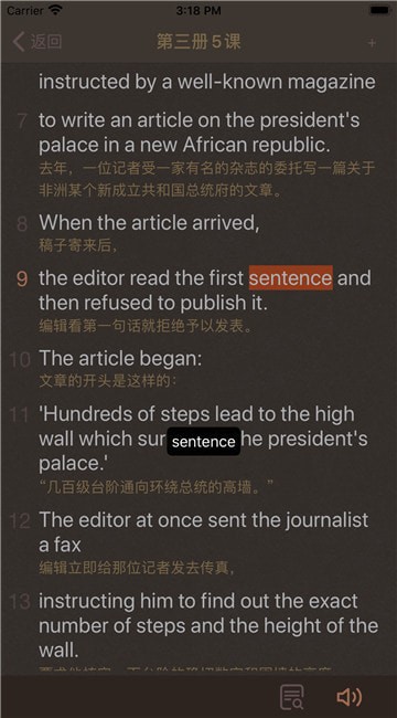 课文“精读”必须熟悉单词准确的含义和用法。长按句中的单词,App就会取词,调用手机词典查词。