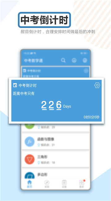 中考数学通免费版是一款手机数学辅导学习软件,拥有中考倒计时功能,帮助你合理安排时间做最后的冲刺,在这里你可以进行知识点详解学习,数学公式归纳整理,还可以在线进行历年真题练习,有需要的朋友快来单机8下载使用吧!